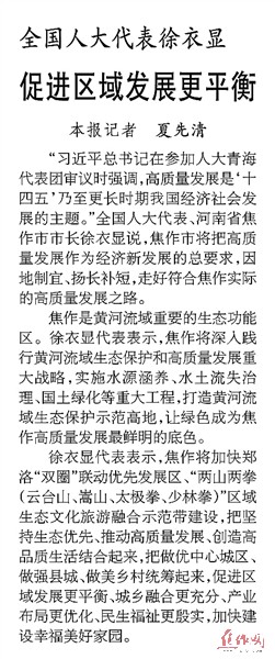 “习近平总书记在参加人大青海代表团审议时强调,高质量发展是‘十四五’乃至更长时期我国经济社会发展的主题。”昨日,全国人大代表、河南省焦作市市长徐衣显接受经济日报记者采访时说,焦作市将把高质量发展作为经济新发展的总要求,因地制宜、扬长补短,走好符合焦作实际的高质量发展之路。