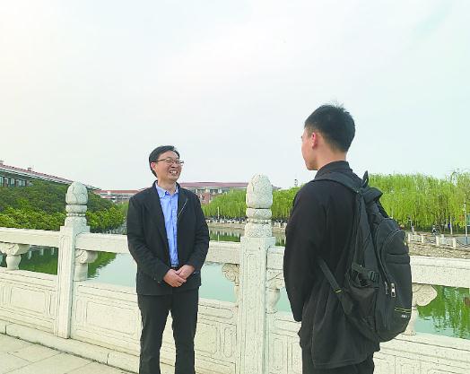 仝兆景(左)在校园里和学生交谈,解答相关问题。