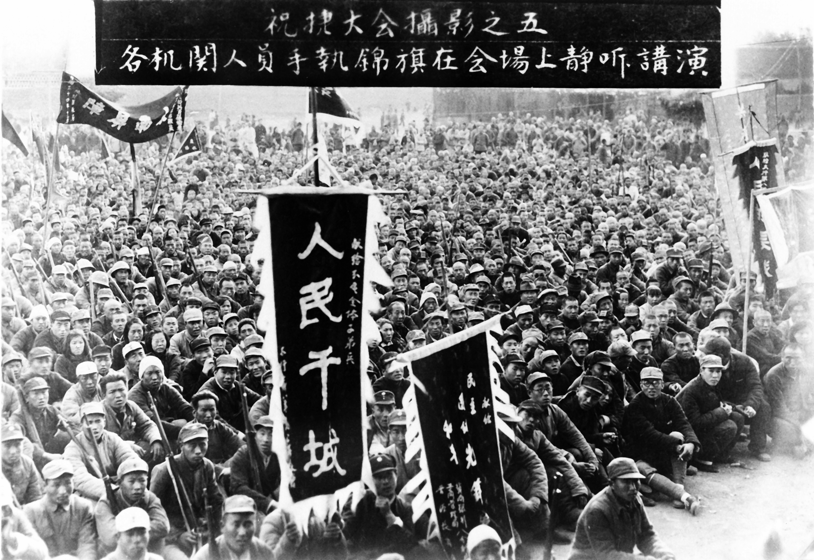 1945年9月抗日战争胜利后,我军民在焦作广场(今焦作贸易大厦处)召开万人祝捷大会。
