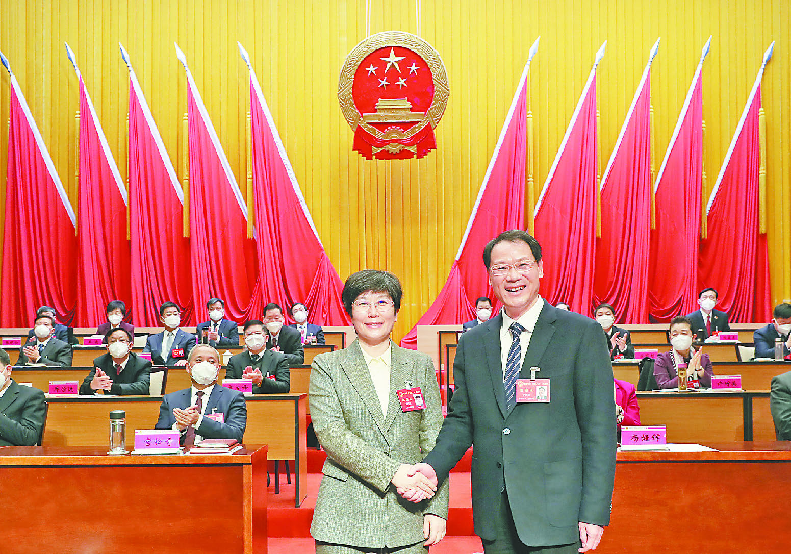 市委书记葛巧红与新当选的焦作市第十四届人民代表大会常务委员会主任李民生握手表示祝贺。