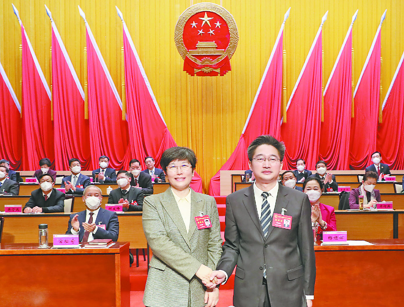 市委书记葛巧红与新当选的焦作市人民政府市长李亦博握手表示祝贺。