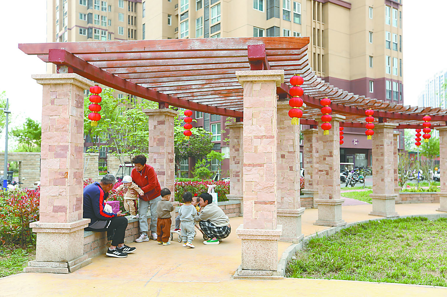 上图 小区里的长廊、座椅设计,方便老年人随时坐下来休息。