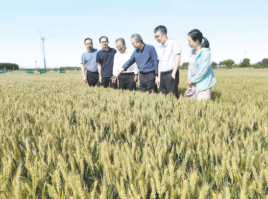 5月15日,中原学者、河南科技学院小麦研究中心教授茹振钢(左三)来到我市,查看小麦大田生产情况,并对温县河南平安种业有限公司的小麦新品系进行品种考察。他表示,后期如果没有大的自然灾害,预计今年又是一个丰收年。
