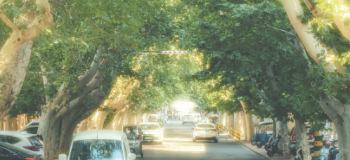 焦东路车水马龙,喧嚣终日不绝。而梧桐树只是静静守着,看霓虹闪烁,见证行人匆匆。它在动与静的缝隙里,站成一道沉默的风景,任时光飞逝,历史在它深深浅浅的绿荫里从容流淌。