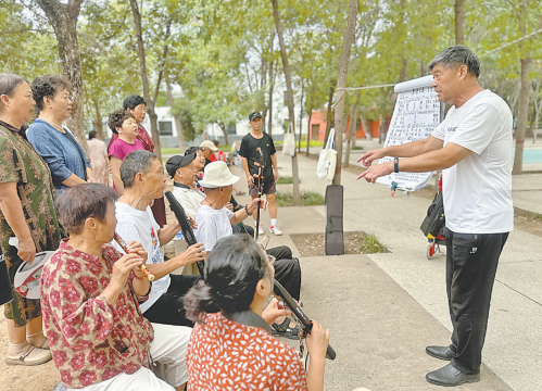 秋日午后的市人民公园,微风拂过树梢,洒下斑驳的光影,真一个秋高气爽的好时节。时间刚过16时,树荫下的空地上渐渐热闹起来,数十位银发老人陆续聚拢,自发站成整齐的两排。电子管的悠扬旋律率先响起,紧接着,二胡浑厚的音色、笛子清亮的曲调交织在一起,缓缓萦绕在公园的每个角落。一位精神矍铄的老者走到队伍前方的指挥位置,深吸一口气后,手臂随着音乐声有力扬起,“五星红旗迎风飘扬,胜利歌声多么响亮……”大家齐声合唱,歌声瞬间打破了午后的宁静。