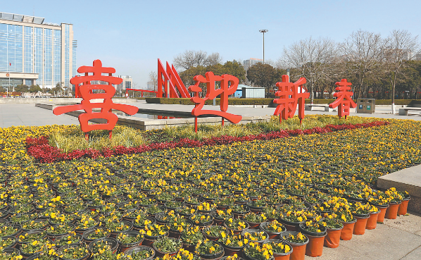 图② 市人民广场上的“喜迎新春”花卉布置。