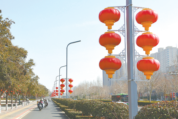 图③ 人民路上,一串串大红灯笼高高挂起。