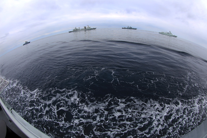 在日本海某海域进行的“北部·联合-2023”演习中,中俄双方舰艇编队航行(2023年7月20日摄)。新华社发(张海龙 摄)