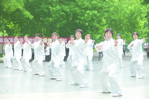 8月8日,在河南省焦作市温县太极游园,市民在全民健身日活动中表演八段锦。