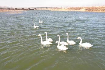 1月4日,阳光明媚,记者在大沙河上看到,白天鹅遨游在水面上。波光粼粼的水面、结伴嬉戏的天鹅,勾勒出人与自然和谐共生的美丽画卷。