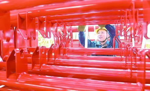 1月21日,焦作科瑞森重装股份有限公司的工人在安装输送装备配件。今年年初以来,该公司订单不断,各生产车间一派繁忙的生产景象,为实现全年产销目标开好局、起好步,力拼“开门红”。
