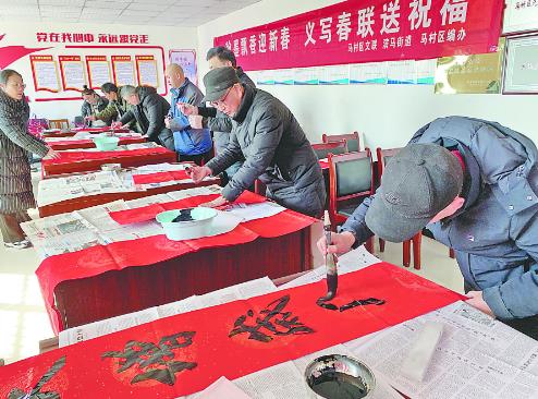 1月23日,马村区演马街道党群服务中心,书画家们挥毫泼墨,为群众义写春联。连日来,马村区委编办与区文联等部门联合开展送上一副春联、进行一次慰问、深入一家企业走访、组织一场助农团购等“新春六个一”活动,把党的关怀和政府的温暖送到群众心坎上。