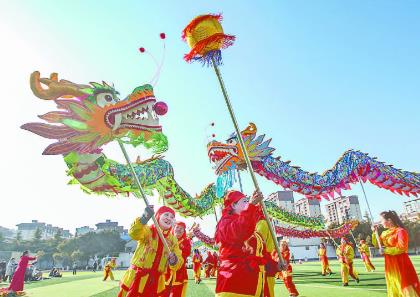 1月28日,博爱县体育广场,博爱空竹舞龙艺术团的成员在表演“金龙迎春”。当天,该艺术团在体育广场上进行空竹、彩带龙、长龙等不同艺术形式的表演,为观众们奉上一场视觉盛宴。