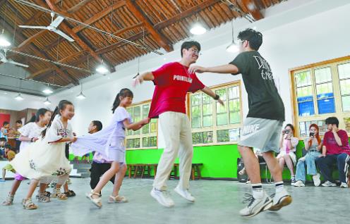 7月18日,沁阳市崇义镇西苟庄村,苏州大学的大学生志愿者在暑期支教活动中带着小朋友做“老鹰抓小鸡”游戏。暑假期间,孩子们参加形式多样的活动,丰富假期体验,乐享暑期时光。