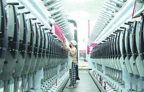 7月24日,修武县虹纬纺织有限公司工人在纺纱。该公司今年新购置德国赐来福智能络筒机25台,对年产10万锭纱线项目的工艺流程进行优化升级,大大减轻了工人的劳动强度。今年上半年,该公司已实现主营收入5682.98万元。