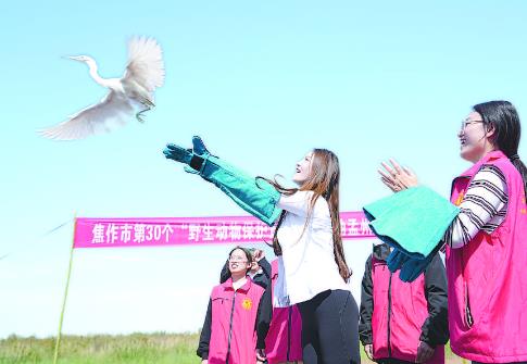 10月10日,孟州市鸟类保护志愿者在河南黄河湿地国家级自然保护区孟州段1号觅食地将1只小白鹭放归大自然。今年10月份是河南省第30个“野生动物保护宣传月”。当日,该市将10只经过救助康复、具备野外生存能力的红隼、松雀鹰、白鹭等国家二级和“三有”保护野生动物放归大自然。