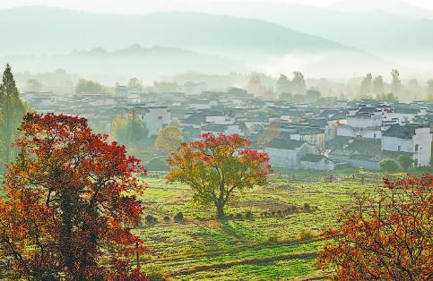 11月13日,在安徽省黄山市黟县卢村拍摄的冬日晨景(无人机照片)。
