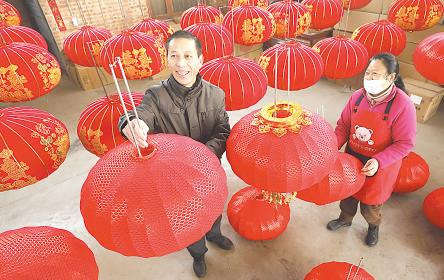 1月1日,武陟县西陶镇石荆村一家大红灯笼生产作坊,工人将制作好的灯笼悬挂展示。春节将至,在武陟县西陶镇,从事灯笼制作加工产业的村民忙着赶制大红灯笼,供应节日市场。