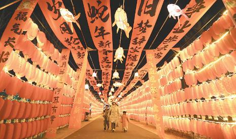 春节期间,人们纷纷走出家门,游景点、品年味、赏民俗,参加各类活动,尽情享受多彩假日。图为游客在太行盆景园赏灯。