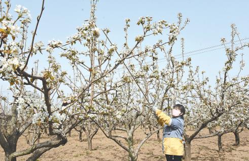 4月6日,孟州市会昌街道廉桥村果农在梨园给梨花进行人工授粉。据悉,该街道依托黄河滩区的土地、生态优势,采取“基地+合作社+农户”模式,积极引导群众发展特色产业,打造农旅融合田园观光综合体,带动农民增收,助力乡村振兴。