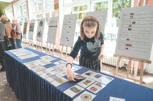 4月19日,一名女孩在波黑萨拉热窝举行的甘肃民间艺术展上挑选明信片。为庆祝“国际中文日”,以“中国非遗 世界共享”为主题的甘肃民间艺术展当天在波黑萨拉热窝大学哲学院开幕。