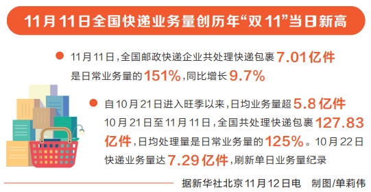 今年快递业务旺季时间久、战线长。自10月21日进入旺季以来,截至11月11日24时,全省邮政快递业累计揽收快递包裹6.35亿件,日均业务量达2885万件。其中,10月22日揽收快递包裹3391万件,刷新单日业务量纪录。
