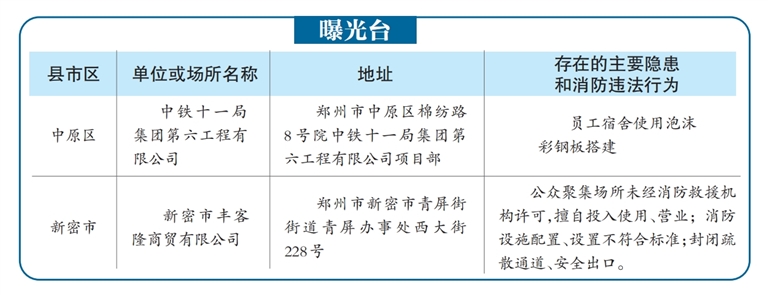 顶端新闻·河南商报讯(记者 刘远怀)11月22日,郑州市消防救援支队公布了本月第二轮消防隐患和违法行为,两家上榜单位分别是中铁十一局集团第六工程有限公司和新密市丰客隆商贸有限公司。