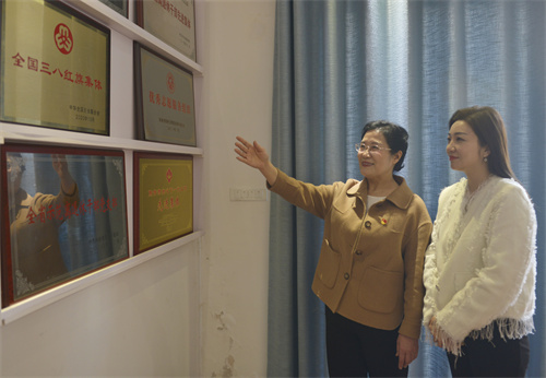 山阳区艺新街道冬香好妈妈工作站党支部书记张冬香为记者介绍该站所获得的荣誉。