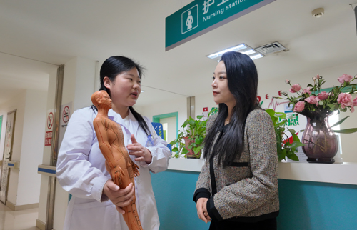 市第四人民医院中医科主治医师王丽萍为记者介绍人体穴位。