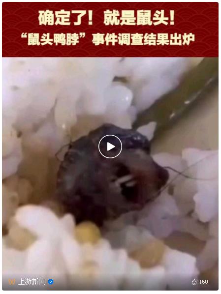 是鼠头,不是鸭脖!6月17日,“江西工职院‘6·1’食品安全事件”联合调查组通报,据专家判定,异物为老鼠类啮齿动物头部。南昌市市场监督管理局已吊销涉事食堂食品经营许可证,对涉事企业和法定代表人顶格处罚。下一步,将依法依规严肃处理江西工业职业技术学院、南昌高新区市场监督管理局昌东分局等相关责任单位、涉事企业和责任人,并在全省开展食品安全专项整治,抓好源头治理,切实保障人民群众食品安全。