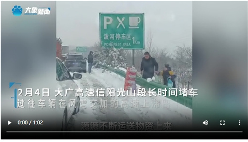 2月4日,大广高速信阳光山段发生大堵车,过往车辆在风雪交加的高速上滞留十几个小时。河南信阳村民免费给高速滞留车辆的司乘人员送泡面热水引关注。这对感动全网的夫妇,是家住信阳市光山县泼陂河镇余庄社区的谈先亮、易明艳夫妇。