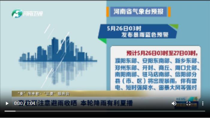 河南省气象台5月26日03时发布暴雨蓝色预警:预计5月26日03时至27日03时,濮阳东部、安阳东南部、新乡东部、郑州东部、开封、商丘、周口北部、南阳南部、驻马店南部、信阳部分县(市、区)将出现暴雨,伴有雷电、短时强降水、雷暴大风等强对流天气。本轮降水5月27日3时趋于结束。
