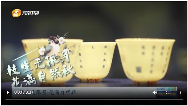 开封市博物馆讲解员 张丽楠:那在这里,其实展示的就是清代康熙年间,由景德镇御窑厂烧制的一整套十二月花卉杯,也是比较典型的脱胎瓷器,每个杯子只有20多克,像纸一样薄,那中秋节是在十月份,那十月对应的是哪一款杯子,其实就是这一款十月份的桂花杯,上面配的诗句其实就是:枝生无限月,花满自然秋。其实桂花和我们中秋节之间的渊源,从宋代开始人们在中秋节的夜晚,会在桂花盛开的季节,欣赏一轮明月的同时,再来一杯香浓的桂花酒成为了当时节日的习俗,一直延续到我们现在,其实在开封博物馆里,除了桂花的元素和我们中秋节有关系,也有很多的一些元素,我们可以一起去寻找一下。
