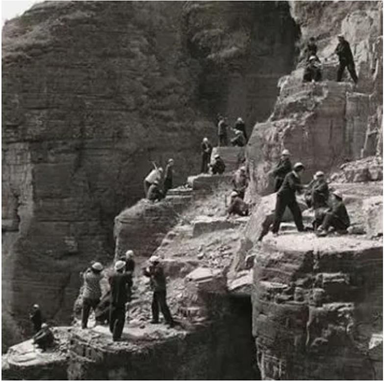 修渠前群众吃水困难,要跑到十几里外取水 图源:人工天河图片展新中国成立后,林县县委带领人民集中力量兴修水利、治理水土流失。到1959年底,全县建成天桥渠、淇河渠、英雄渠等46条引水渠道和要街、弓上、南谷洞等36座中、小型水库,一定程度上解决了307个村、28万人的吃水难题,水土流失也得到了基本控制。正当人们乐观地以为缺水再也不是问题时,1959年,林县再次遭遇大旱,境内江河几乎断流,开凿的水渠全部干涸。这年夏天,林县县委提出,从林县穿越太行山到山西,斩断浊漳河,将水引进林县,彻底改变林县的缺水状况,这个计划得到了河南省委和山西省委的支持。然而,引漳入林需要穿越千山万壑的太行山。在当时的条件下,其难度不亚于移走一座大山。但林县人民没有畏惧,他们抱定了“宁愿苦战,不愿苦熬”的信念,修红旗渠的石灰自己烧、水泥自己产、炸药自己配;没地方住,便睡在山崖下、石板上、石缝中;粮食不够,就吃杂粮、挖野菜、捞水草;缺资金,许多外出务工的林县人攒下几块、几十块,寄回来支援家乡建设……浊漳河两岸,太行山的峭壁如同刀削斧砍,林县人腰系绳索,足蹬悬岩,与大自然进行着生死较量,全县50余万人先后有30多万人次自带工具上山劳动。无数个闪亮的名字,永远镌刻在红旗渠的丰碑上。