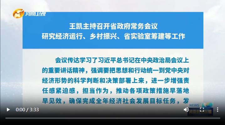 10月9日,省长王凯主持召开省政府常务会议,传达学习贯彻习近平总书记重要讲话,研究经济运行、乡村振兴、省实验室筹建等工作。
