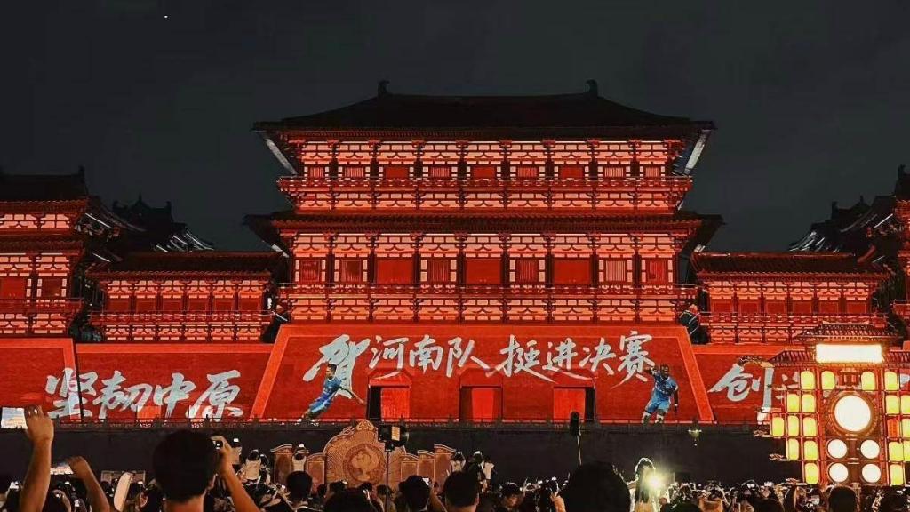 △图为洛阳应天门为河南队首次进入足协杯决赛推出的应援灯光秀