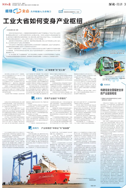 河南正在以“四枢纽三支点”为抓手,建设全国统一大市场循环枢纽,打造国内国际市场双循环支点,其中“建设特色鲜明、安全韧性的产业链接枢纽”对河南更是具有重大战略意义。产业链接枢纽不是单点发力,而是交通物流效率、产业配套效率、协同创新效率、生产服务效率等的协同提升,真正形成链接全国、辐射全球的产业超级枢纽,强化在全球产业体系中的战略链接功能,吸引汇聚产业要素与创新资源,为河南建设具有区域特色的现代化产业体系、因地制宜发展新质生产力注入新动能。