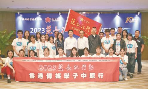 6月25日下午,主题为“行走河南、读懂中国”2023范长江行动——香港传媒学子中原行在河南郑州启动,与会领导与采访团成员合影。