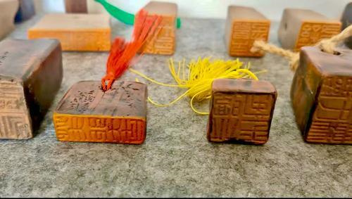 武陟河段的黄河泥富含胶质,经过塑型和烧灼后,能够幻化为青、黄、紫等多种颜色的器皿、乐器和印刻等艺术品。这些黄河泥制品,在一代代非物质文化遗产传承人的手中,逐渐融合了音乐、美术、雕刻、书法等多种技艺,成为兼具欣赏、演奏和实用功能的精美艺术品,宛如一股清流,在传承黄河文化的道路上潺潺流淌。黄河泥印就是其中的代表。
