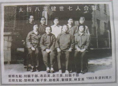 1983年,“八英”健世七人合影(前排左起:妇联干部、连启英、赵兰英、妇联干部;后排左起:郜明英、靳子荣、赵桂英、靳禄英、林发英)。