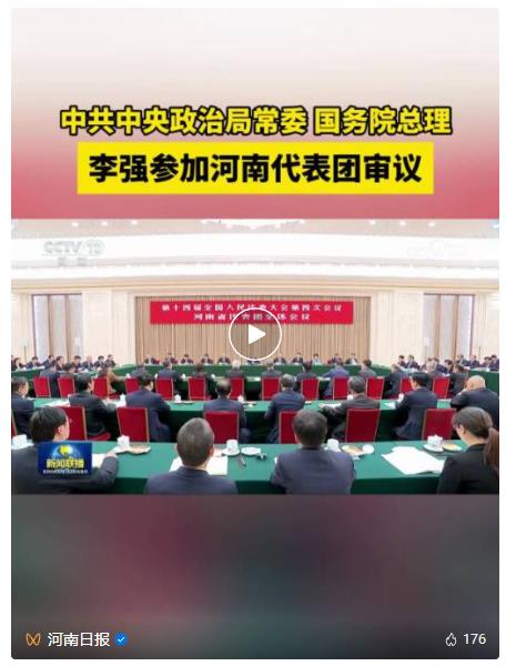 中共中央政治局常委、国务院总理李强参加河南代表团审议。他说,过去一年河南深入贯彻习近平总书记重要指示精神和党中央决策部署,主要指标增速位居前列,向新向优趋势明显。新的一年,要在服务统一大市场建设上力求新作为,在完善现代化产业体系上塑造新优势,在推进新型城镇化上探索新路径,在文旅融合发展上打造新名片。