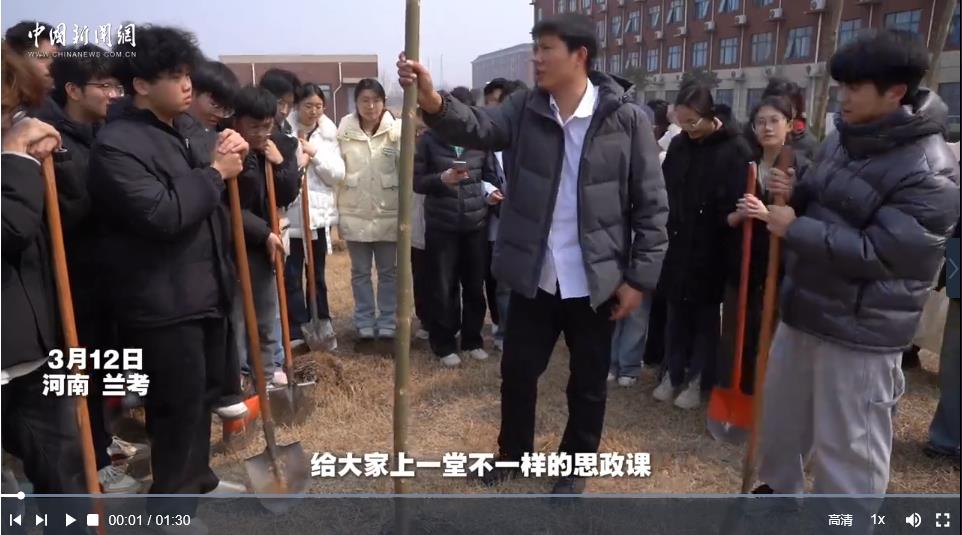 3月12日植树节,河南兰考,郑州工商学院兰考学院把思政课堂搬到劳动实践基地。思政课王径开老师带领学子共植泡桐林,现场讲述焦裕禄书记治沙斗 “三害” 的奋斗历程。以树为媒、以劳育人,让青年在实践中感悟初心使命,将焦裕禄精神深植心中。这堂行走的思政课,接地气、有温度、更铸魂!作者:曹想