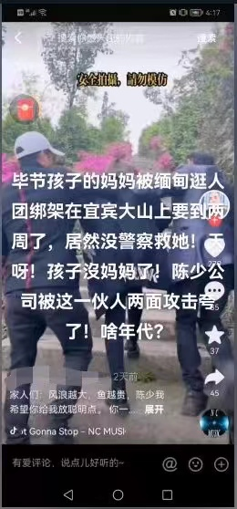 4月27日,某网民发布一则视频称:“毕节孩子的妈妈被缅甸逛人团绑架在宜宾大山上要到两周了,居然没警察救她”。