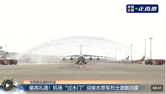 辽宁沈阳桃仙国际机场以“过水门”最高礼遇迎接英雄回家。