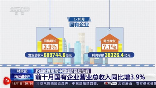 财政部11月30日发布今年前10月全国国有企业经济运行情况。数据显示,1—10月,国有企业营业总收入689744.6亿元,同比增长3.9%;利润总额38326.4亿元,同比增长7.1%。国有企业生产经营持续稳定恢复,叠加去年同期低基数因素影响,主要效益指标呈现较快增长。
