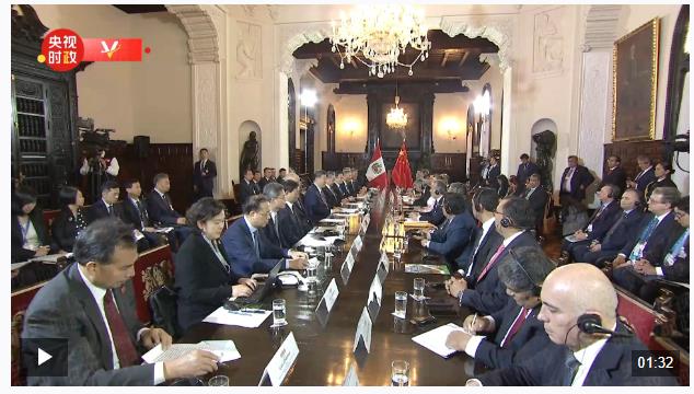 当地时间11月14日下午,国家主席习近平在利马总统府同秘鲁总统博鲁阿尔特举行会谈。