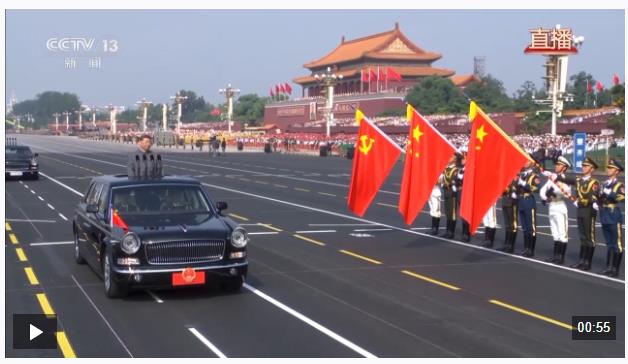 伟大旗帜光耀千秋。中国共产党党旗、中华人民共和国国旗、中国人民解放军军旗在受阅部队最前方迎风招展。检阅车行进至党旗、国旗、军旗前,敬礼号角响起,习近平停车肃立,以注目礼向三面旗帜庄严致敬。