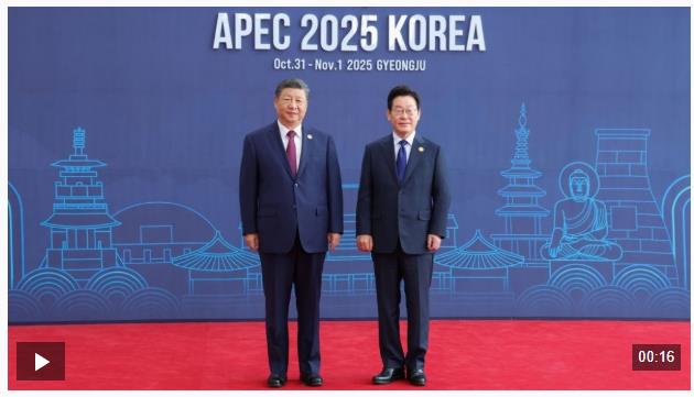 当地时间10月31日上午,亚太经合组织第三十二次领导人非正式会议第一阶段会议在韩国庆州和白会议中心举行。习近平抵达会场时,韩国总统李在明热情迎接,两国元首握手合影。