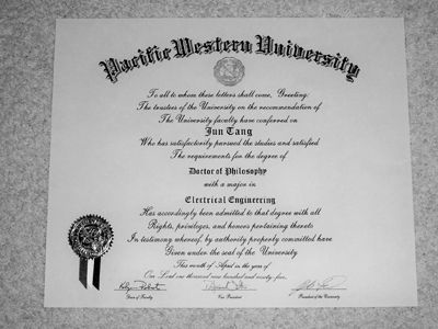 那么,唐骏的博士学位从何而来?他回应称,自己在日本攻读了五年的博士,最后一刻在日本放弃了博士论文答辩去了美国。“最后就在美国一家叫Pacific Western(西太平洋大学)的私立大学进行了他们的辅导做了一些研究,最后拿到了Pacific Western大学的博士学位,这些都有证书在。”唐骏说。