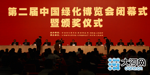 10月5日下午,在第二届中国绿化博览会闭幕式上,举行了隆重的颁奖仪式。绿博会组委会为河南省绿化委员会、河南省林业厅、郑州市人民政府、郑州市林业局颁发了特别贡献奖。向江苏园、山东园、北京园、浙江园、八一园颁发了室外展园特等奖。此外,还评选出金奖10个、银奖20个,优秀组织奖25个、先进单位141个、先进工作者336名。插花花艺活动、盆景奇石、书画摄影展及其他活动也都评出了相关奖项。